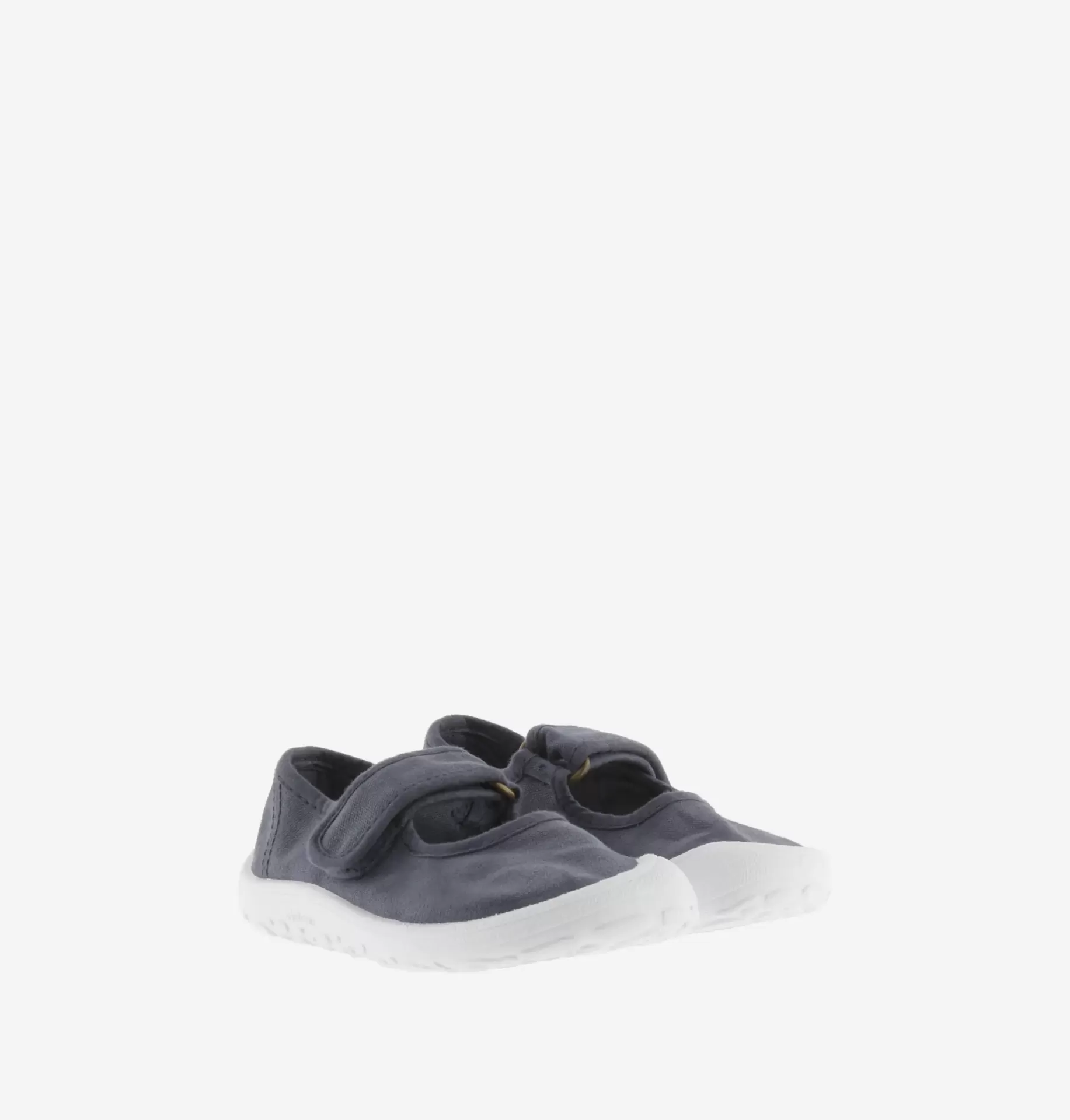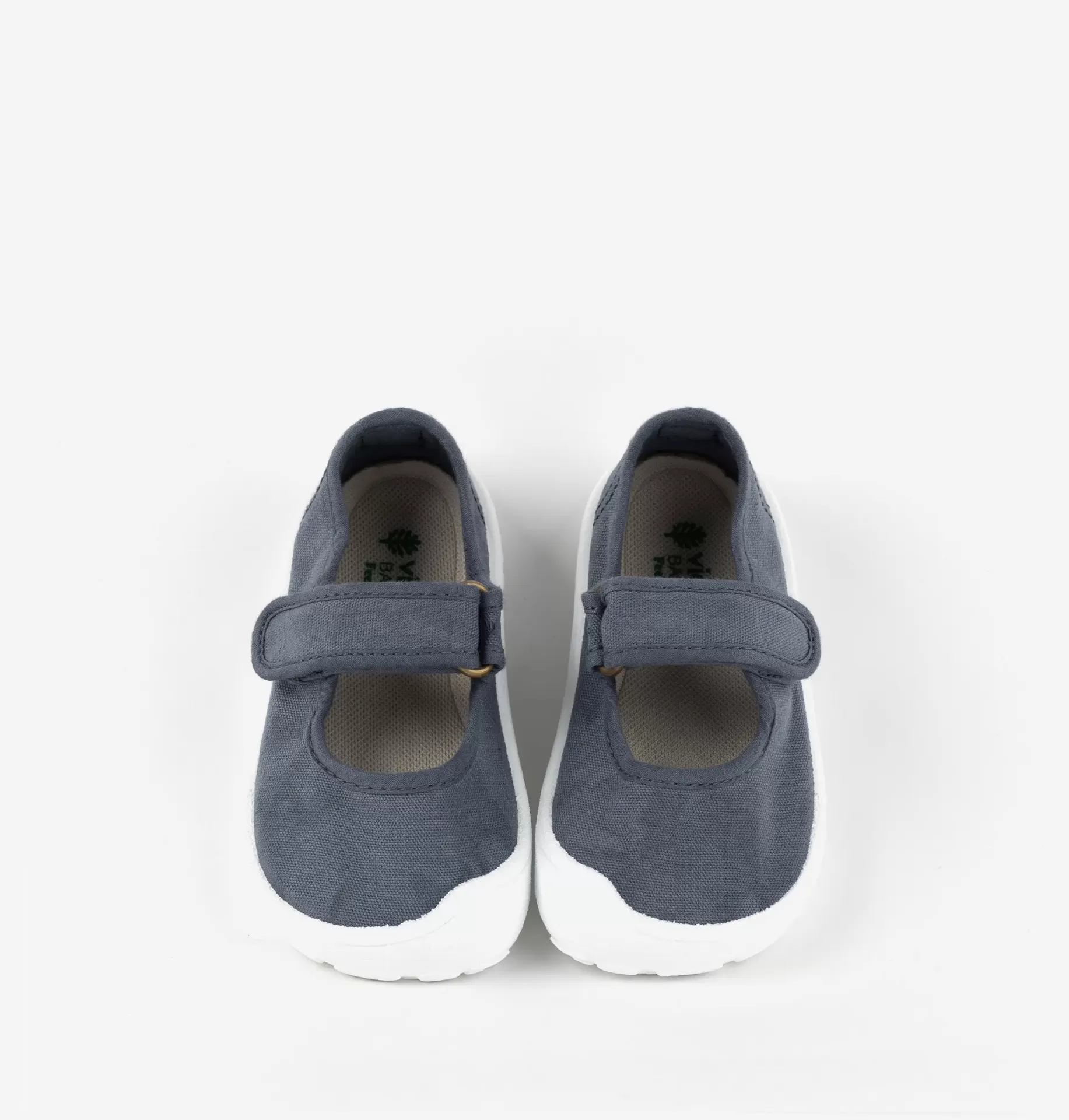 Merceditas respeitadoras barefoot em lona tingida DREC (Dyeable Recycled Eco Cotton). O fecho é feito com uma tira aderente, que facilita o calçar e promove a autonomia. Sola em TR flexível. Modelo sustentável Dear World. Fabricado em Espanha.