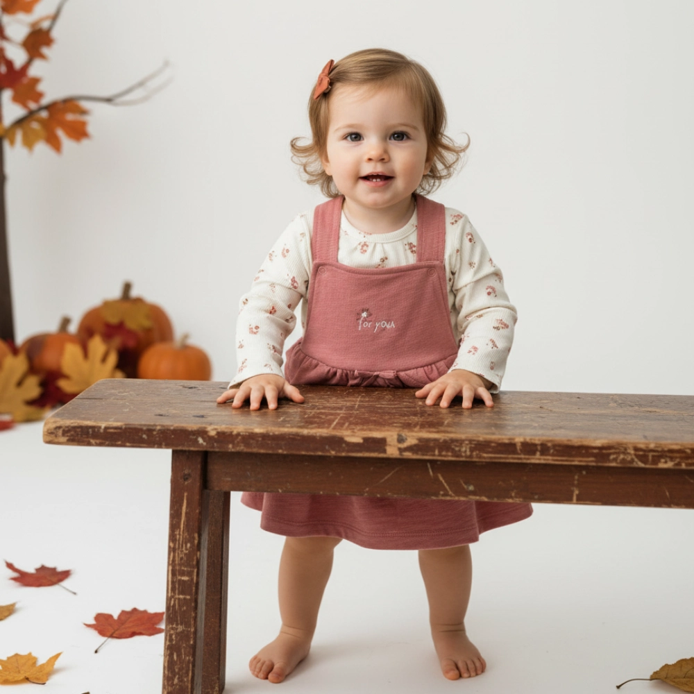 Conjunto infantil com vestido rosa e camisa branca floral sobre superfície de madeira clara com folhas de outono e abóbora