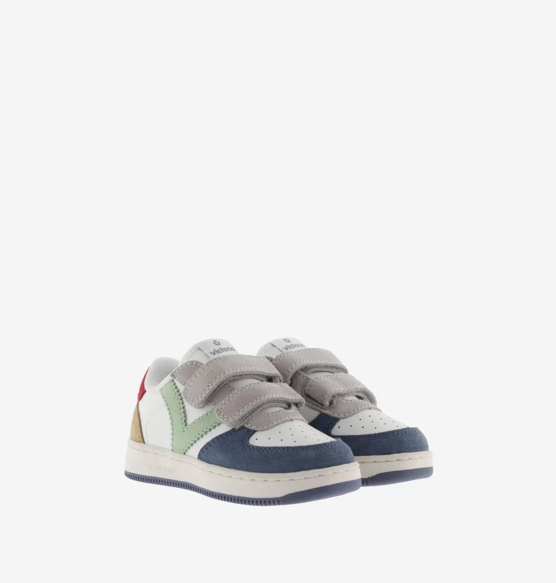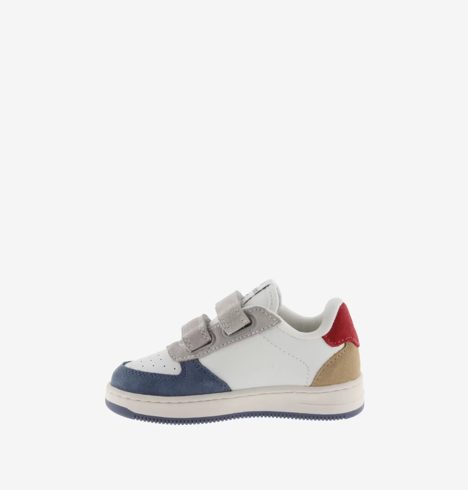Sapatilhas de efeito pele brancas com peças multicolor em camurça. O fecho é feito com tiras aderentes, que facilitam o calçar e promovem a autonomia. A sola bicolor é de TPR e a biqueira é perfurada, para favorecer a respirabilidade.