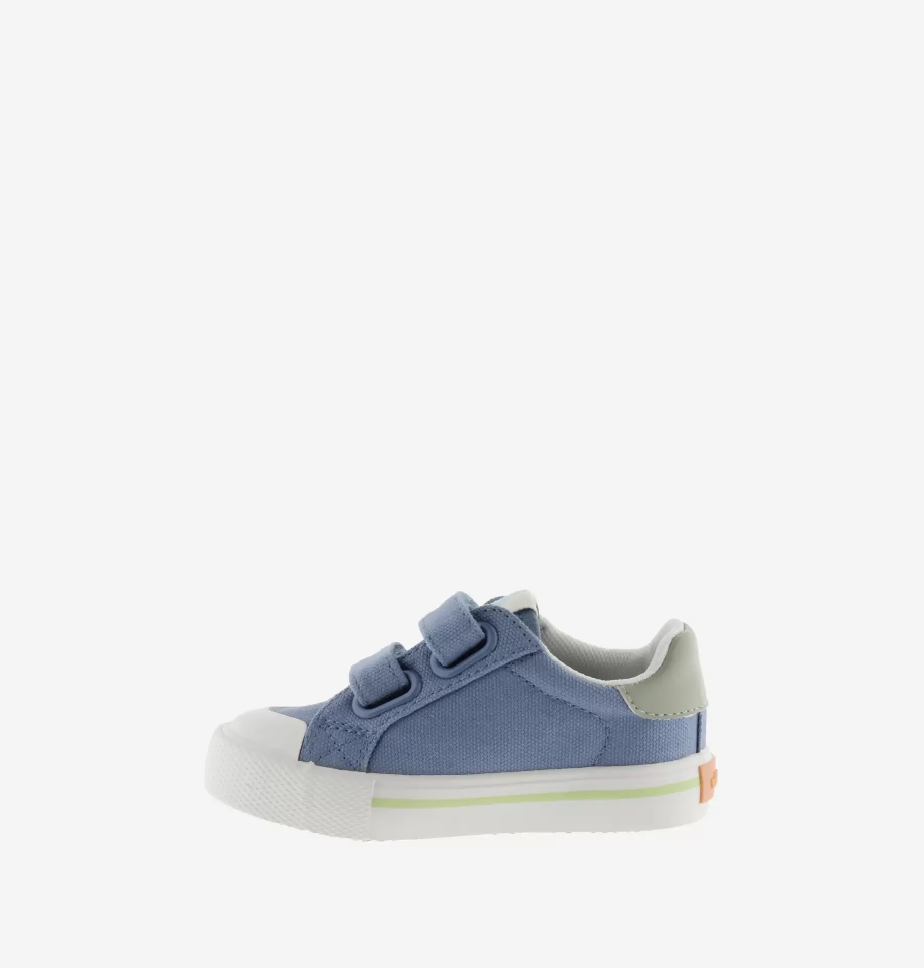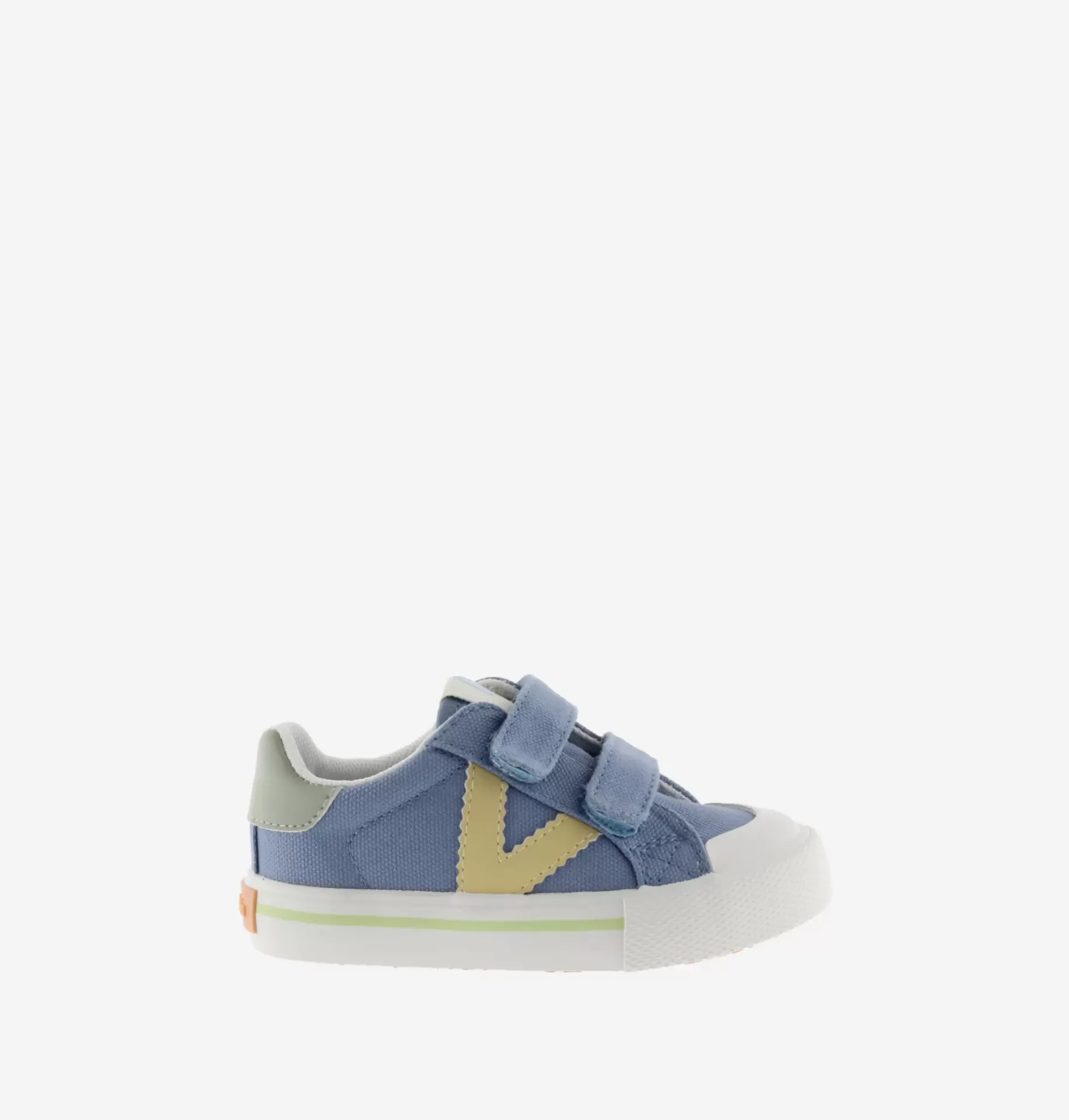 Sapatilhas baixas em lona. O fecho é feito com duas tiras aderentes, que facilitam o calçar e promovem a autonomia. A sola de borracha inclui reforço na biqueira, para maior resistência e durabilidade. Apresentam ainda o logótipo lateral da Victoria e a peça traseira em cores de contraste.