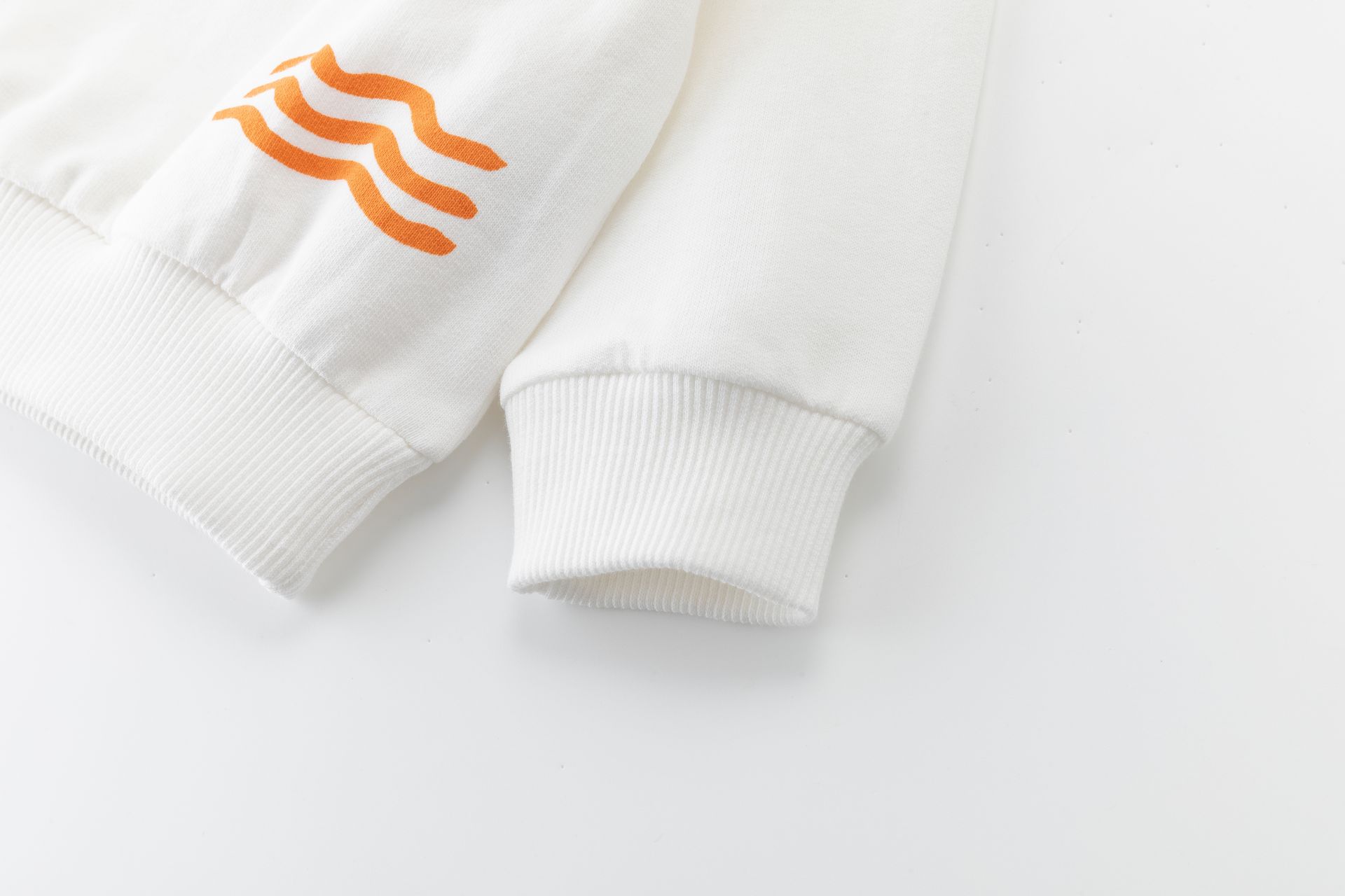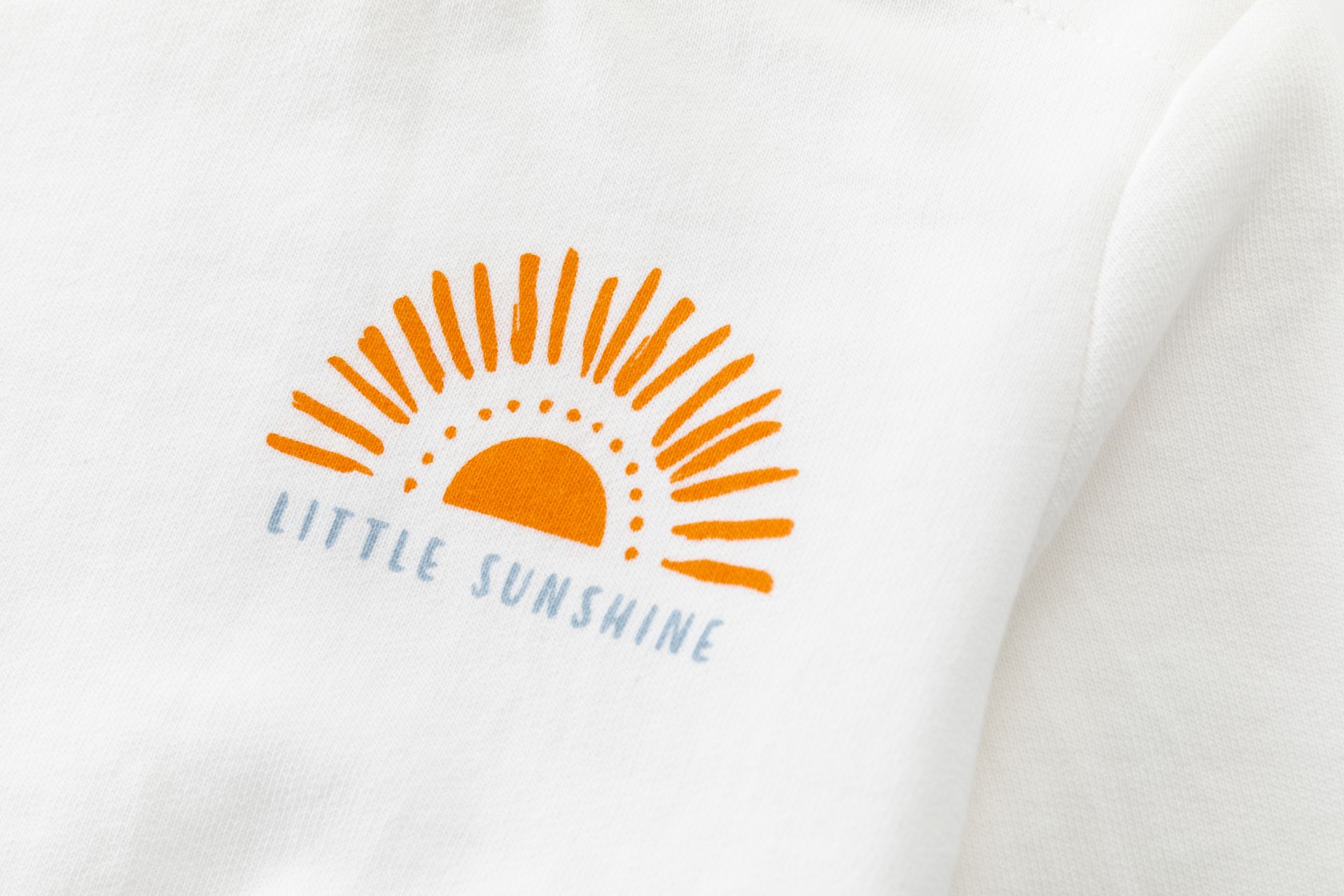 Sweatshirt de bebé em branco com um estampado minimal e alegre: “Little Sunshine”, com sol e ondas em tons laranja e azul. Uma peça super versátil, fácil de conjugar e ideal para a meia-estação.