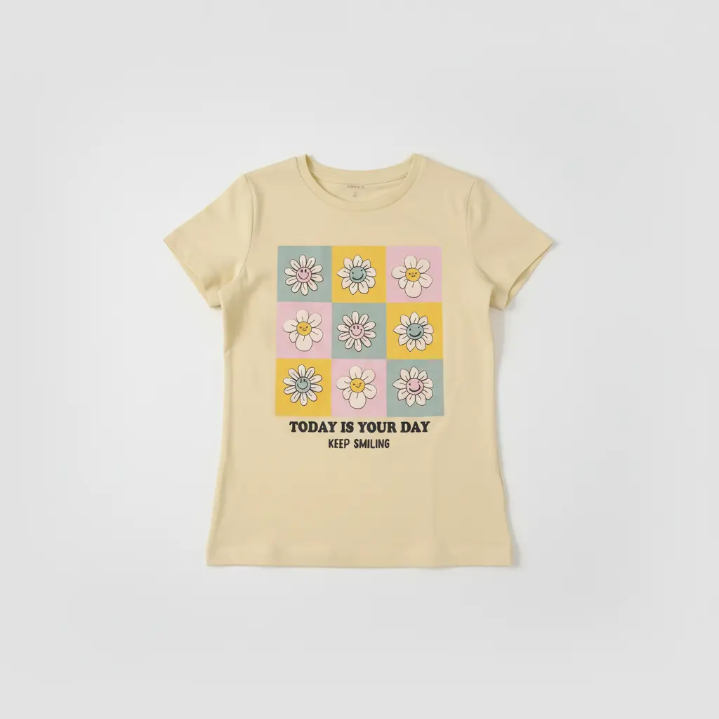 T-shirt em amarelo com estampado frontal de margaridas sorridentes em quadrados coloridos e mensagem “Today is your day – keep smiling”. Uma peça alegre, confortável e perfeita para o dia a dia.