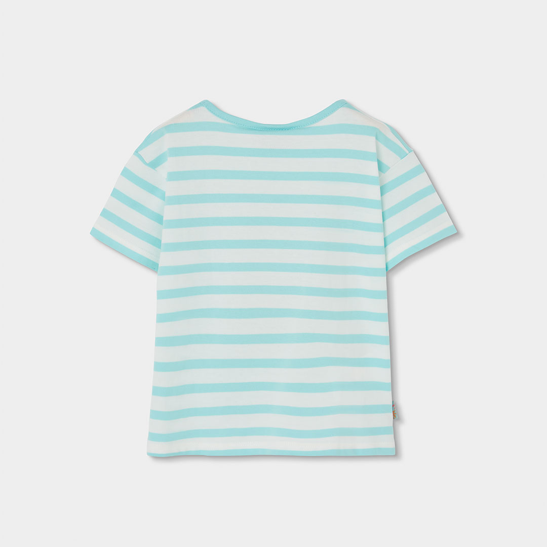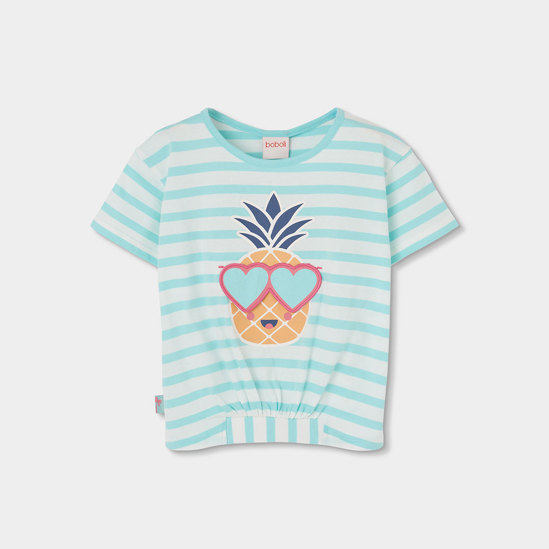 Esta t-shirt de menina combina riscas em tons frescos com um estampado central de ananás com óculos em destaque — um apontamento irresistível para dias de sol. O corte confortável e o detalhe franzido/ajustado na bainha dão um ar ainda mais fofo e atual, ideal para combinar com calções, saias ou jeans.