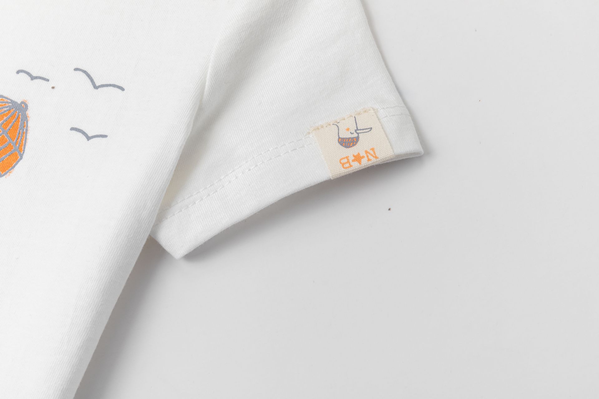 T-shirt de bebé em branco, com um estampado delicado e divertido de gaivota marinheira num barco à vela, em tons cinza e com apontamentos em laranja. Um tema náutico super fofo, perfeito para os dias quentes.