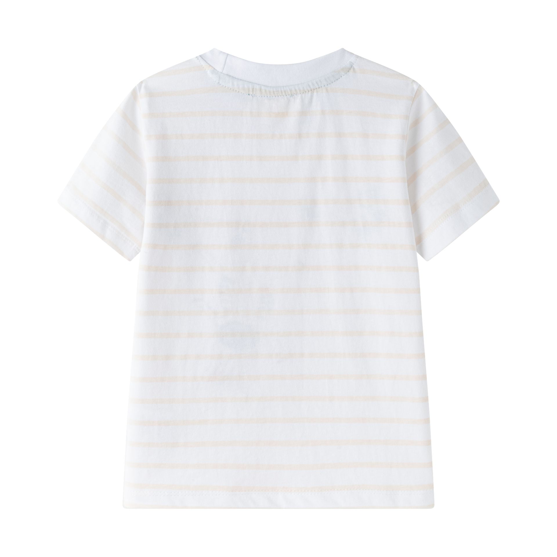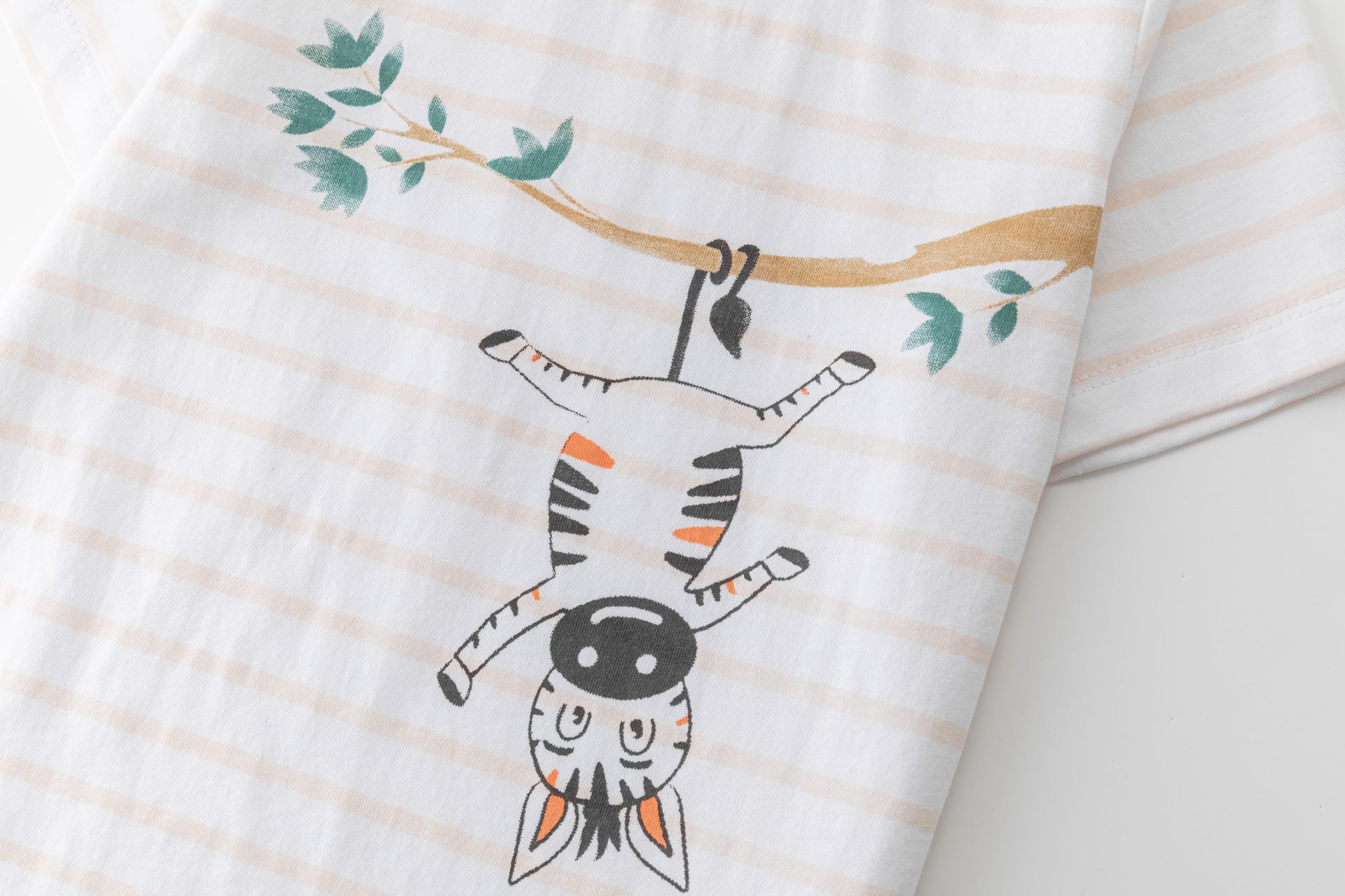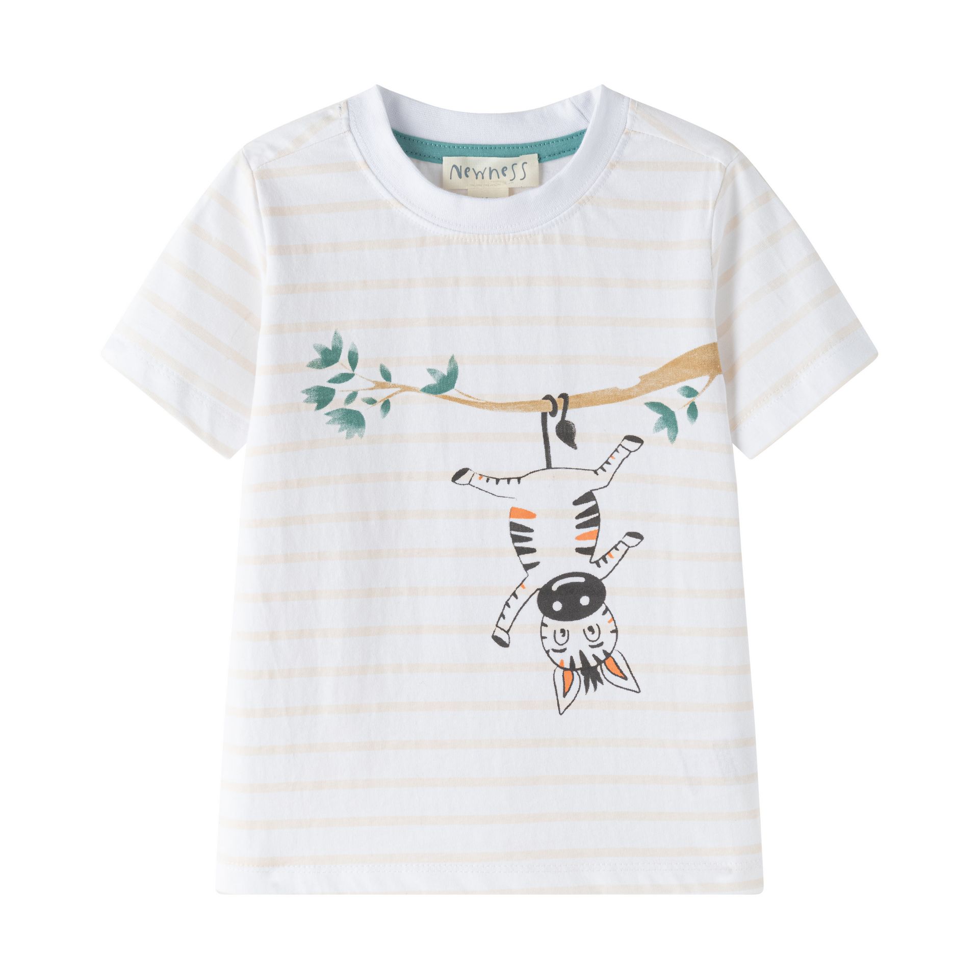 T-shirt de bebé/menino em branco com riscas finas bege e um estampado super giro: uma zebra pendurada num ramo, em estilo divertido e delicado.