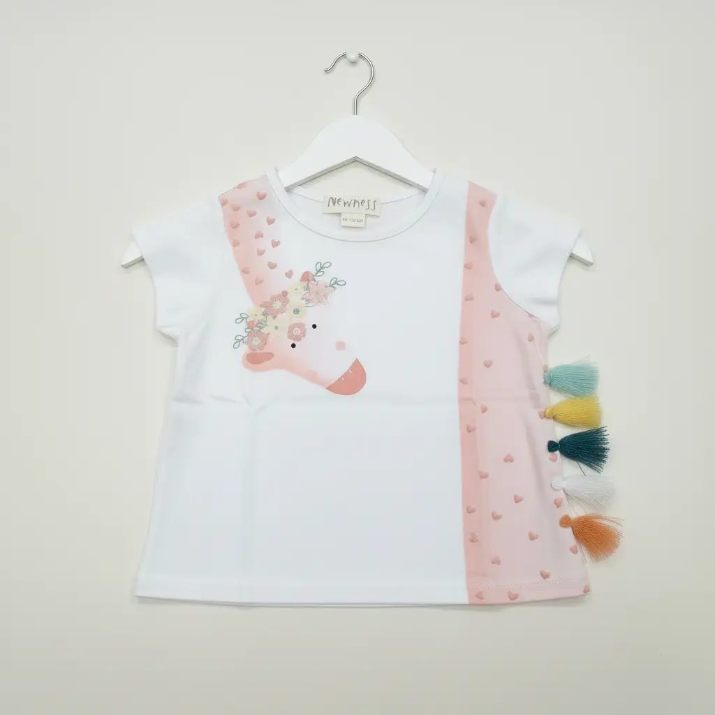 Uma t-shirt branca super especial, com um estampado querido de girafa e uma faixa rosa com pequenos corações, que cria um efeito “camadas” muito giro.