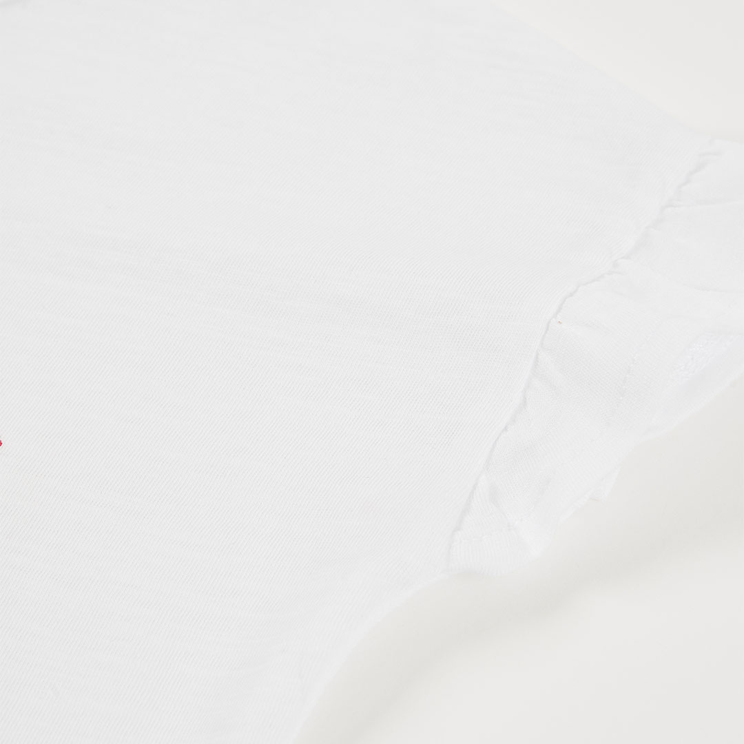 Uma t-shirt que dá logo vontade de sorrir! Em branco, esta t-shirt de menina destaca-se pelo estampado central com uma personagem fofa e óculos coração, com apontamentos brilhantes que tornam a peça ainda mais especial. As mangas com folhinho dão um toque delicado e feminino. Perfeita para combinar com calções, saias ou jeans, é uma escolha fresca e prática para o dia a dia, passeios e férias.