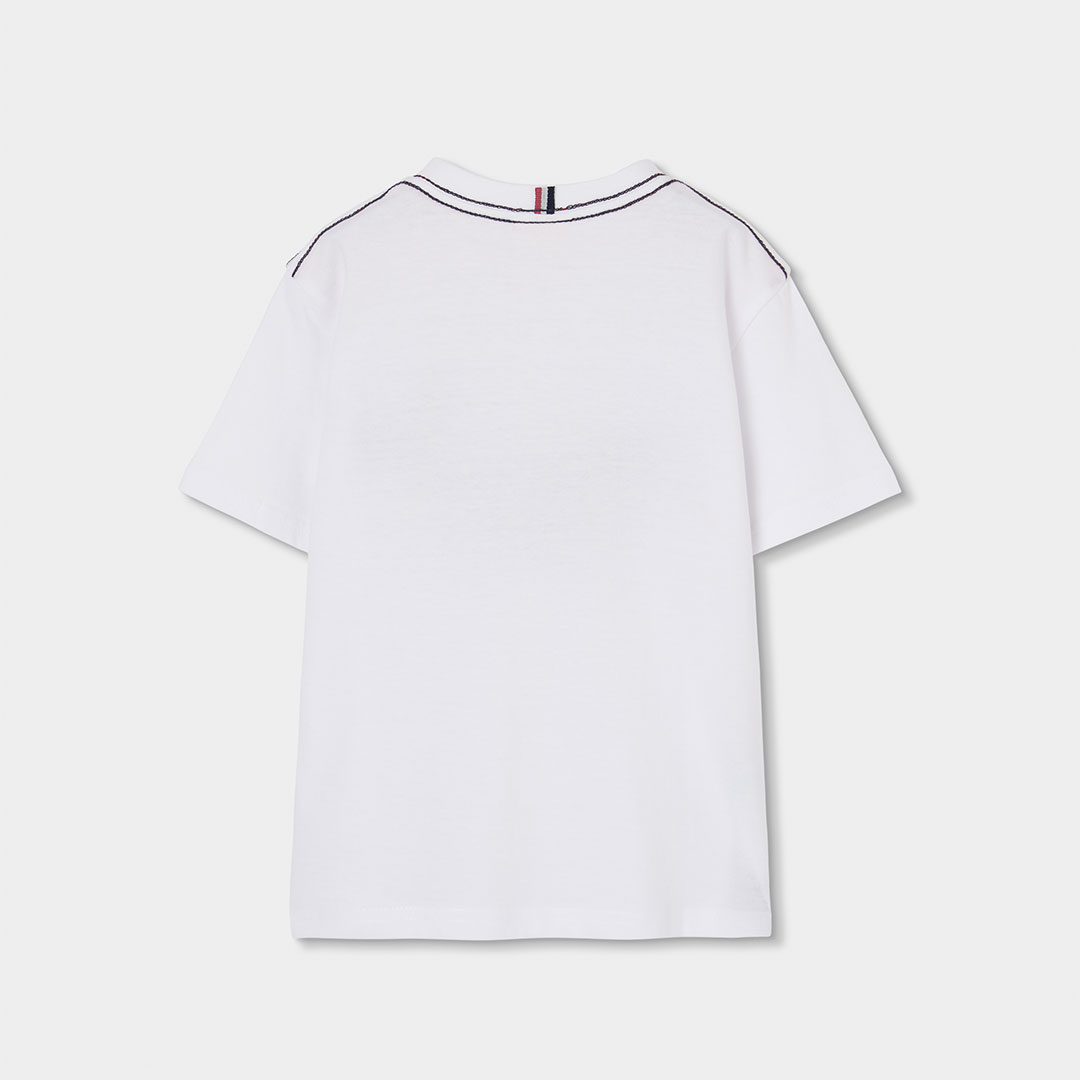 T-shirt branca de menino com um estampado amoroso de baleia e a frase “The Deep Sea”. Um básico com graça: fresca, versátil e super fácil de conjugar com calções, bermudas ou calças para um look confortável, com vibe de verão.