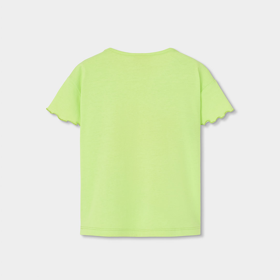 T-shirt de menina em verde lima neon, com estampado divertido “YOU are sunshine” e flor. Manga curta com acabamento ondulado para um toque fofo e diferente. Fresca, confortável e perfeita para looks de primavera/verão.