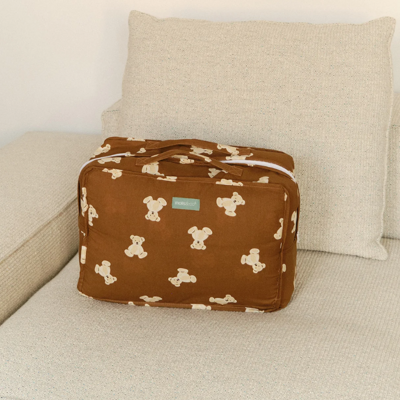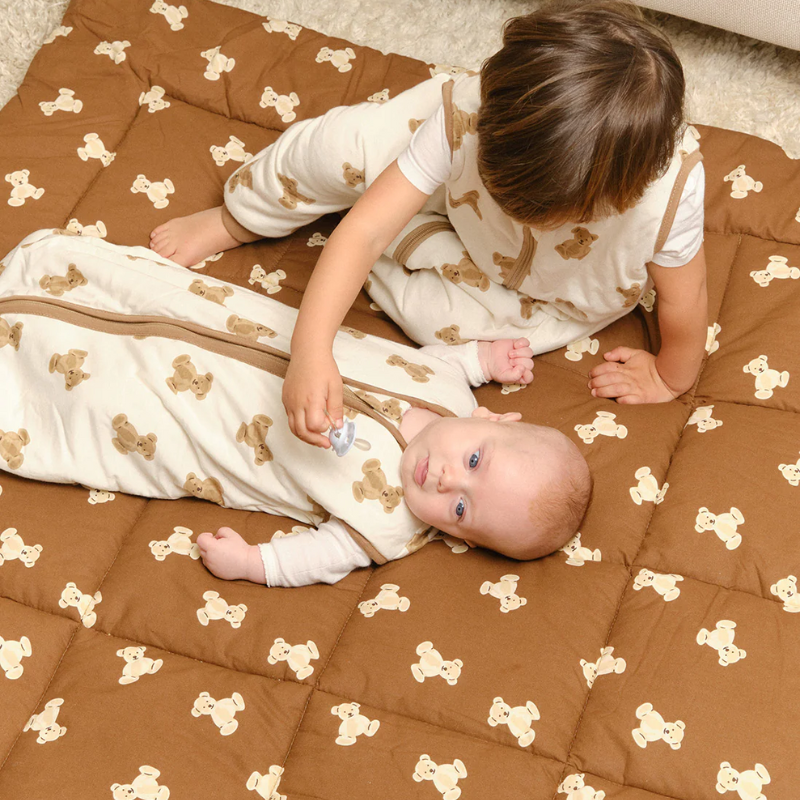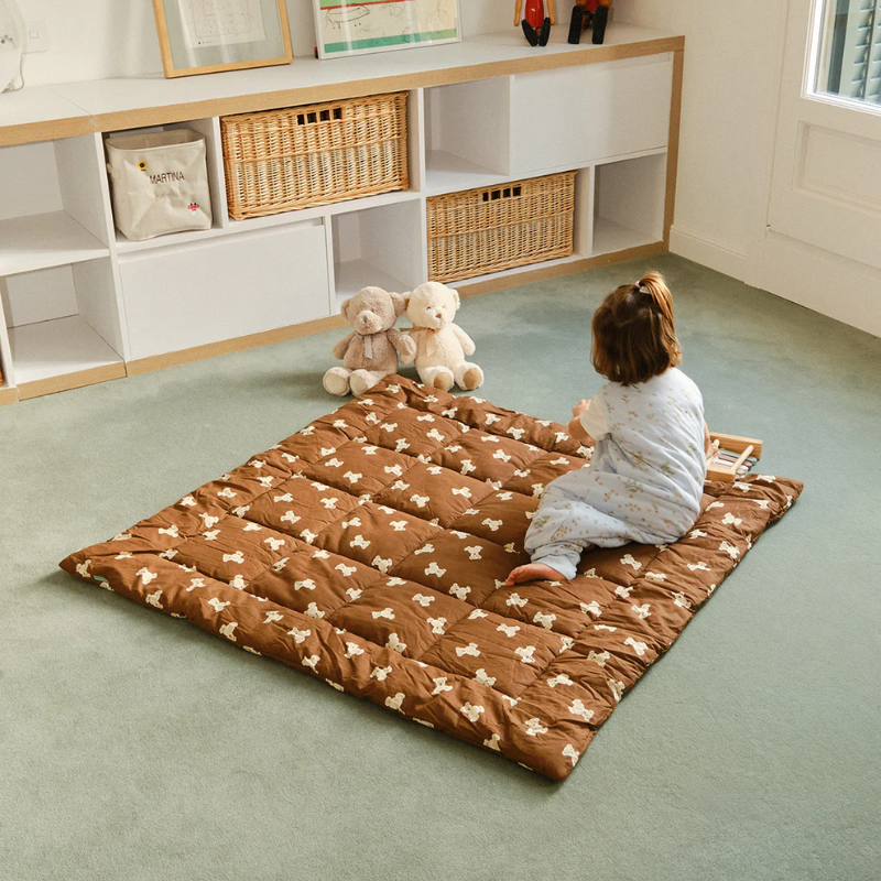 Manta almofadada castanha com padrão de ursinhos com criança sentada em cima