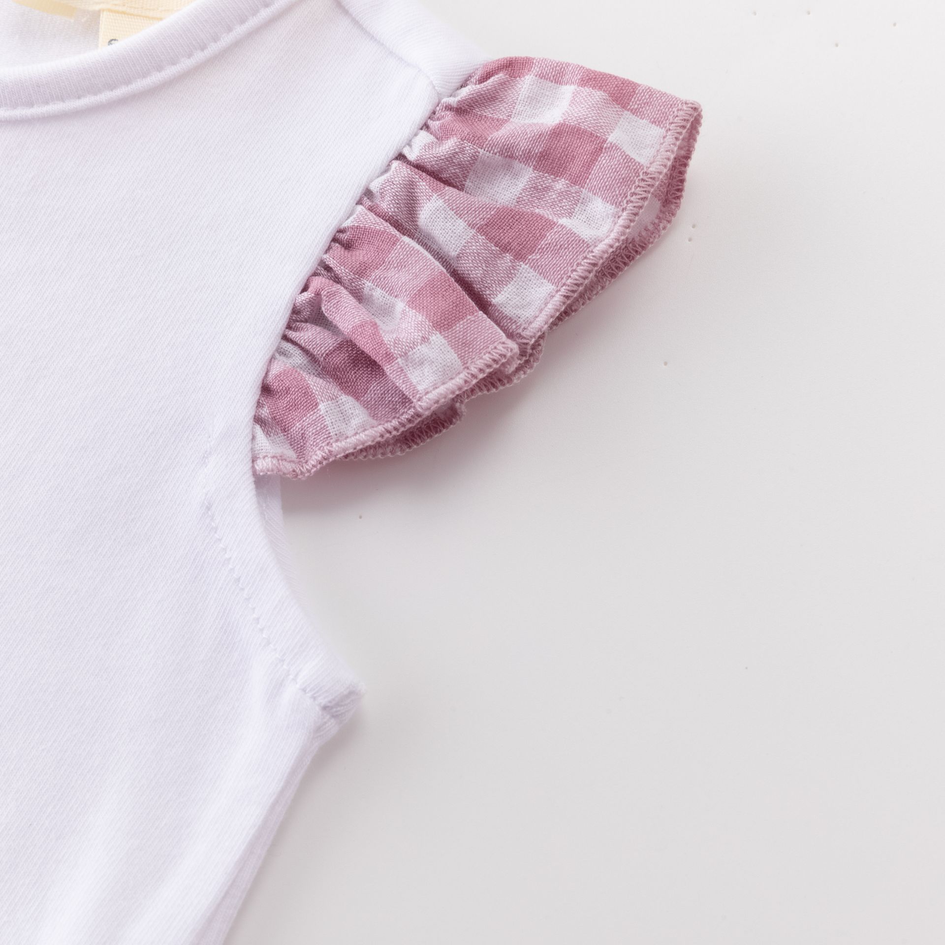 Top de bebé menina em branco, com um estampado suave de cisne em tons pastel e pequenos detalhes delicados. O destaque vai para os folhos nas cavas em padrão vichy rosa, que dão um ar super fofo e arranjadinho.