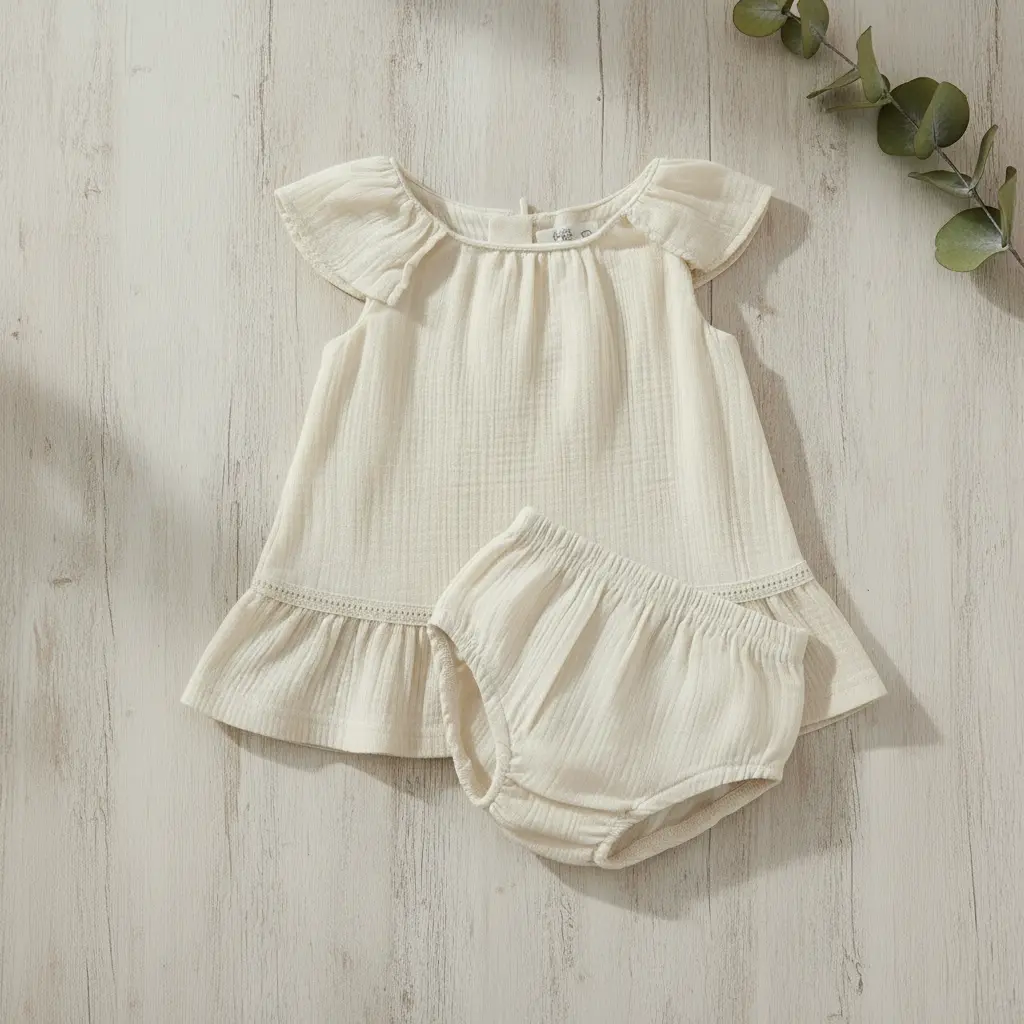 Inclui tapa-fraldas nos tamanhos 18 e 24 Meses, a condizer para um look completo e confortável — ideal para passeios e ocasiões especiais.