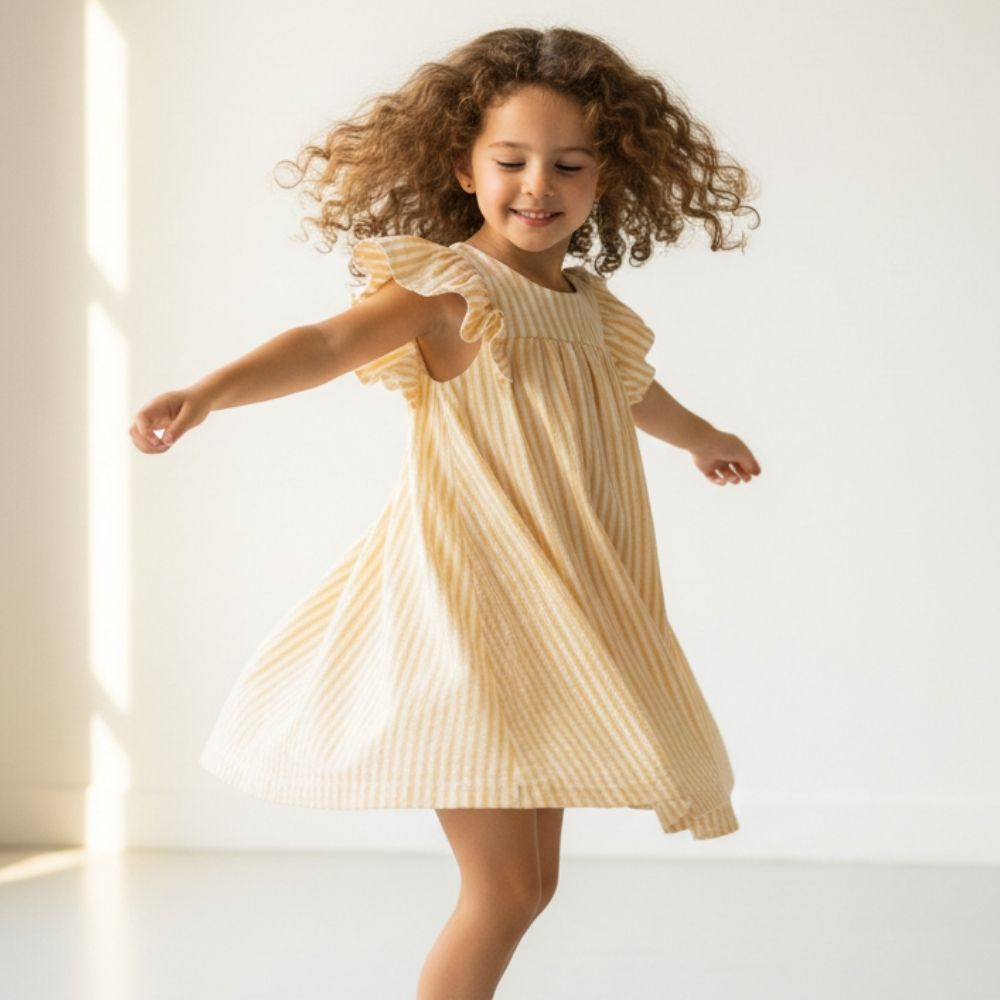 Vestido de menina em algodão leve, com riscas amarelas e design fresco para o verão. Tem mangas com folhos bem marcados, corte solto e confortável e fecho atrás para vestir facilmente. Inclui tapa-fraldas apenas nos tamanhos 18 e 24 meses, a condizer para um look completo, amoroso e prático para passeios e ocasiões especiais.