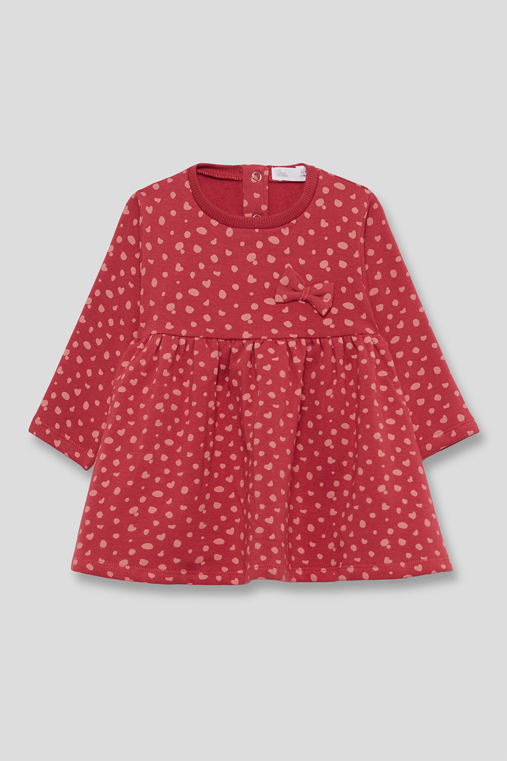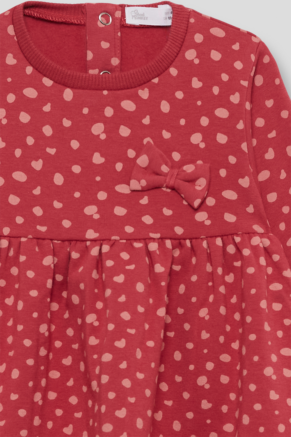 Vestido de manga comprida em cor maquilhagem (rosa nude) com estampado de pequenos corações num tom maquilhagem claro. Apresenta corte alto com franzido que confere voo à saia e um laço decorativo mimoso no peito, a combinar com o tecido. Decote redondo e costas com fecho por botões para facilitar o vestir. Confeccionado em tecido suave e quentinho, perfeito para os dias mais frescos de inverno.