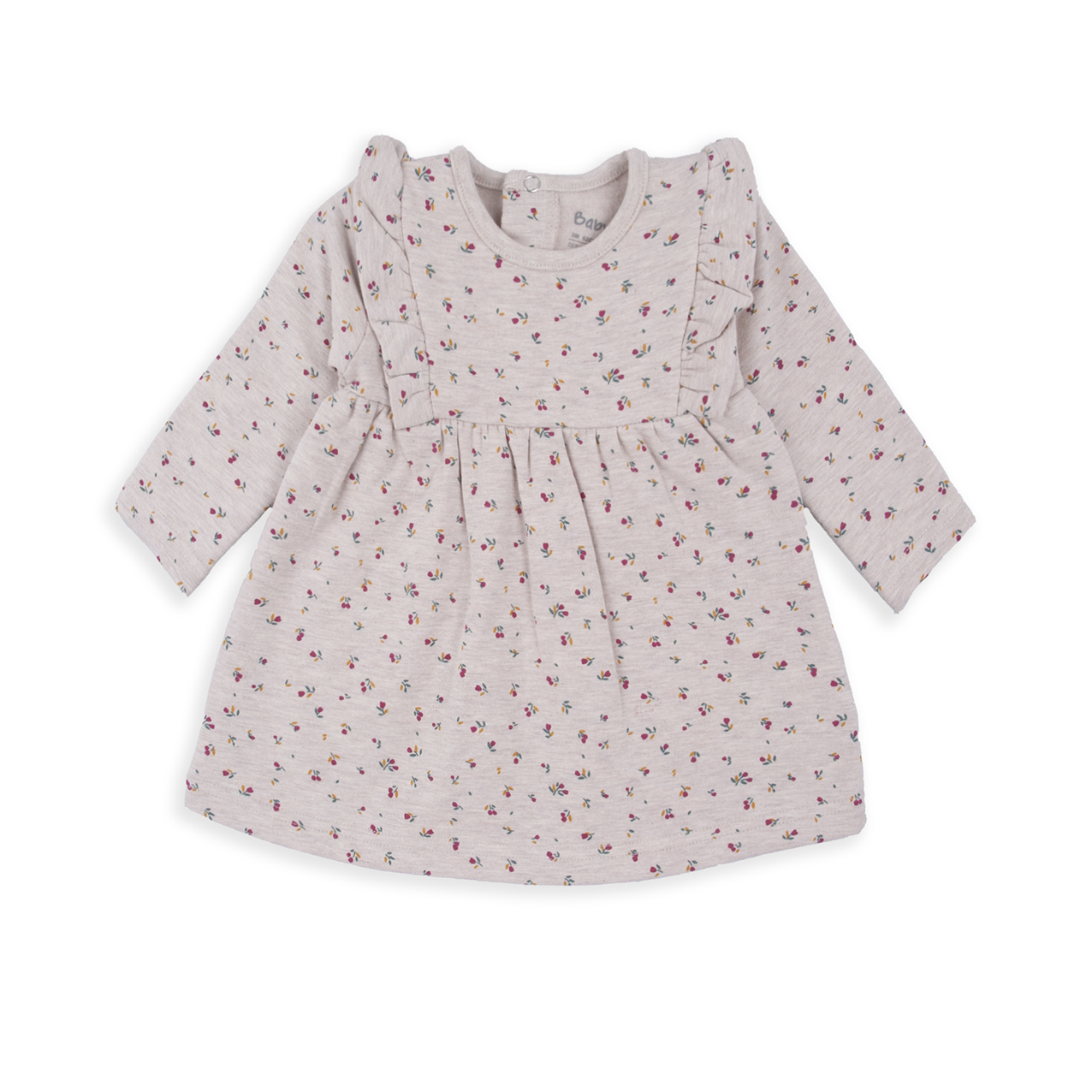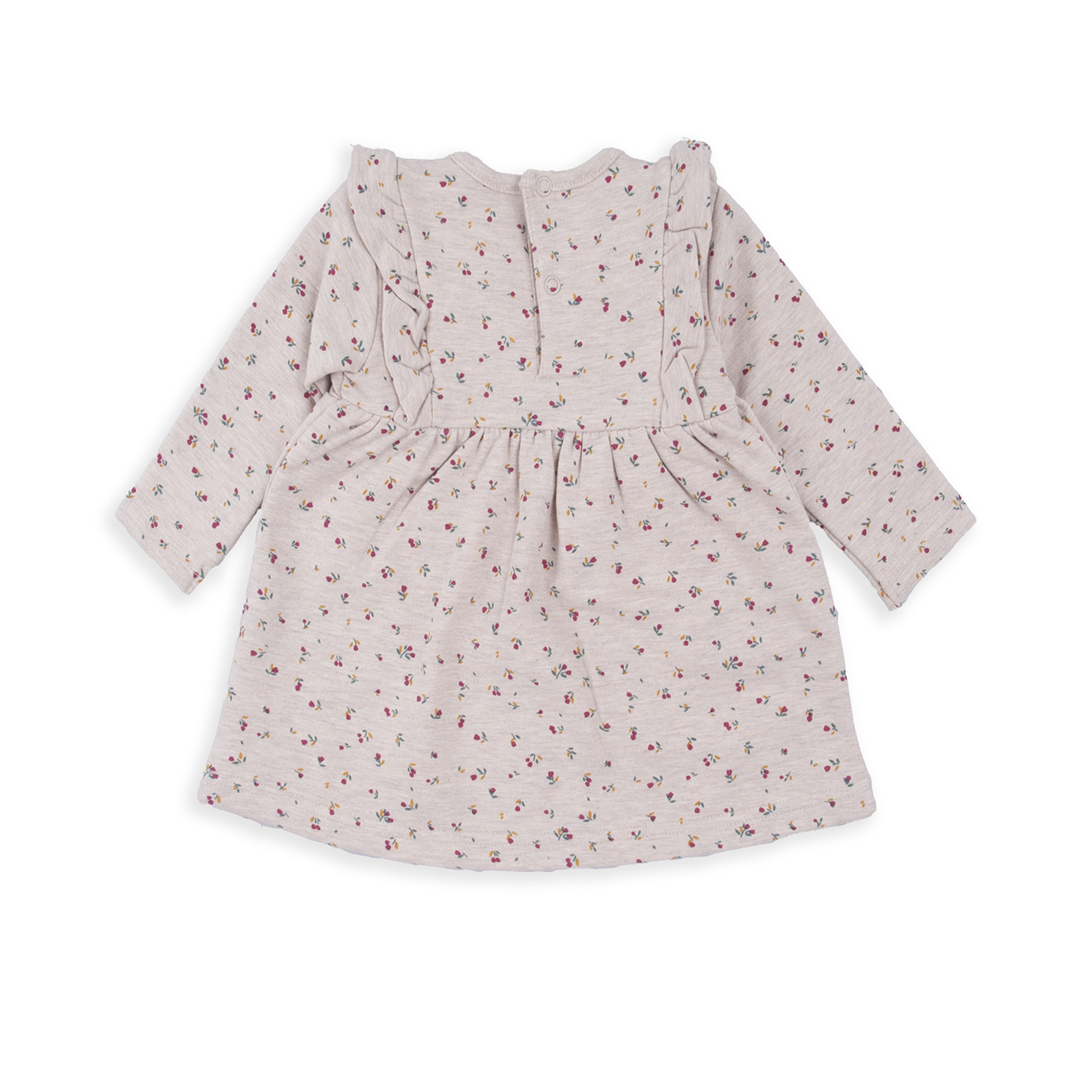 Vestido de menina em malha suave cardada por dentro (quentinha), com padrão floral miúdo em tom neutro. Modelo com  folhos delicados nos ombros e manga comprida. Confortável para o dia-a-dia, com look doce e intemporal.
