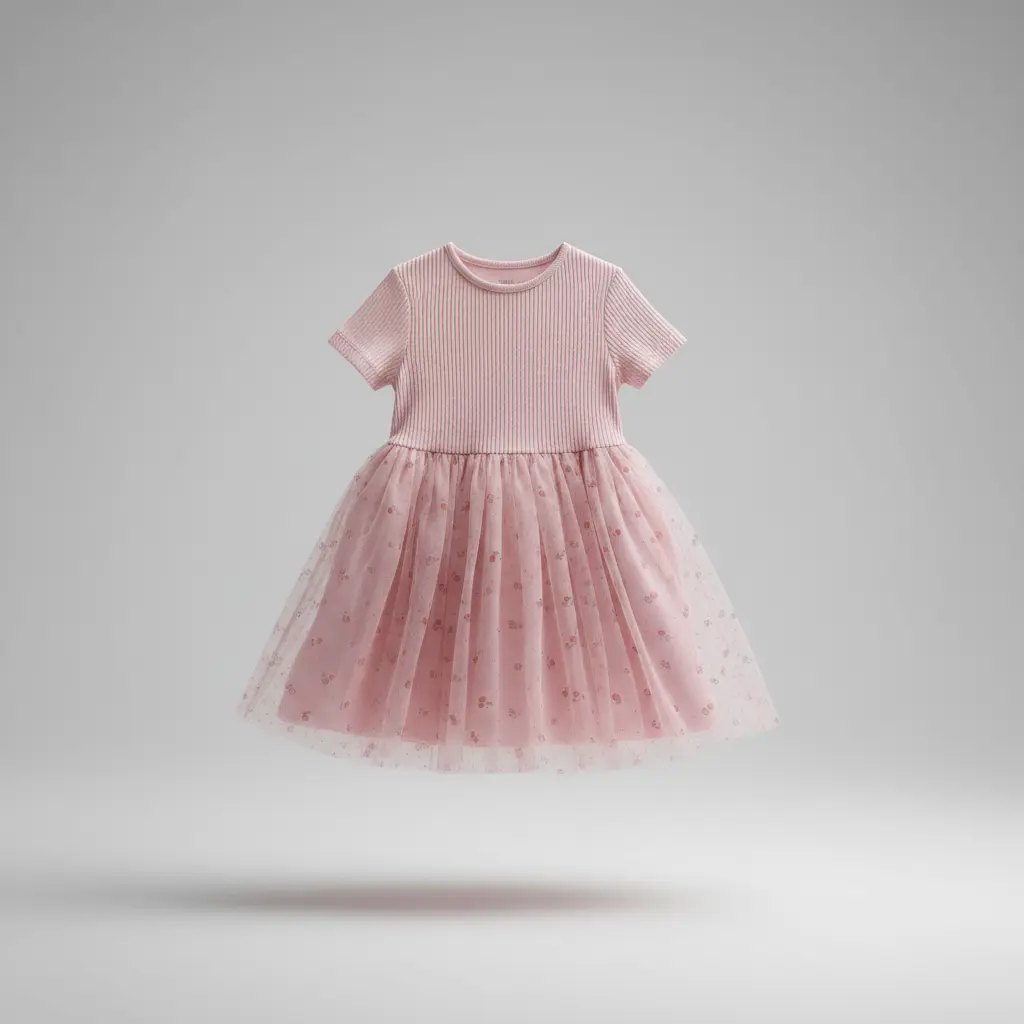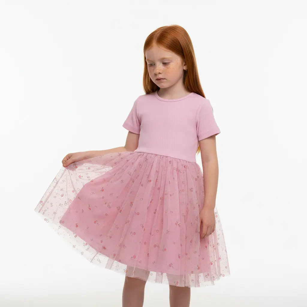 Vestido para menina em rosa, com parte superior lisa e confortável e saia de tule com estampado delicado. Um look perfeito para festas, aniversários e cerimónias.
