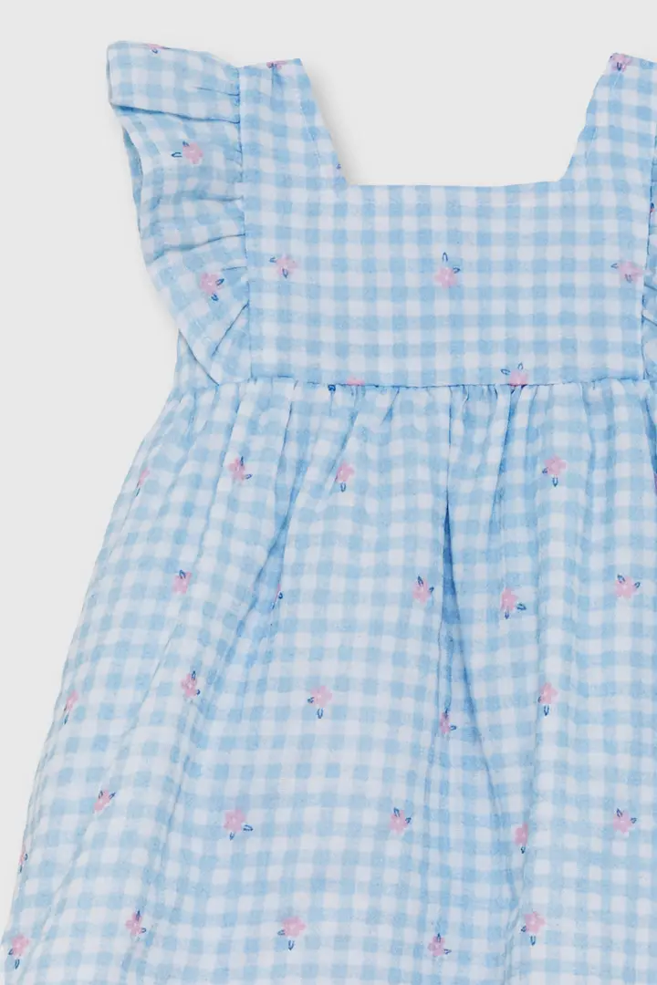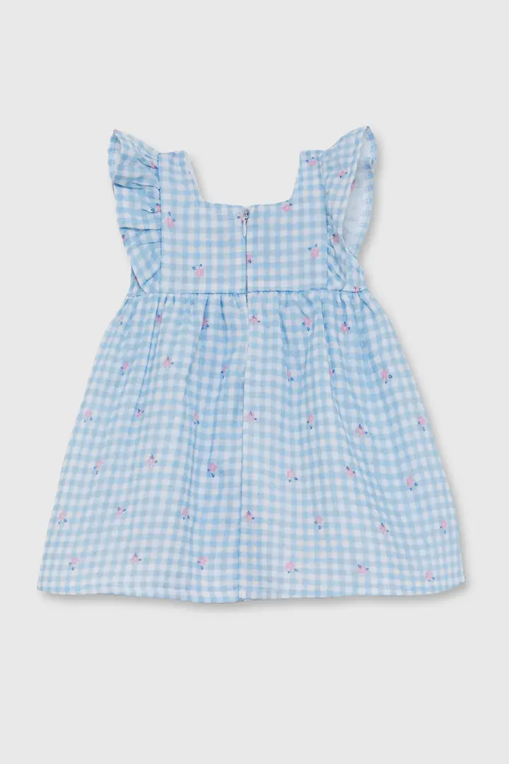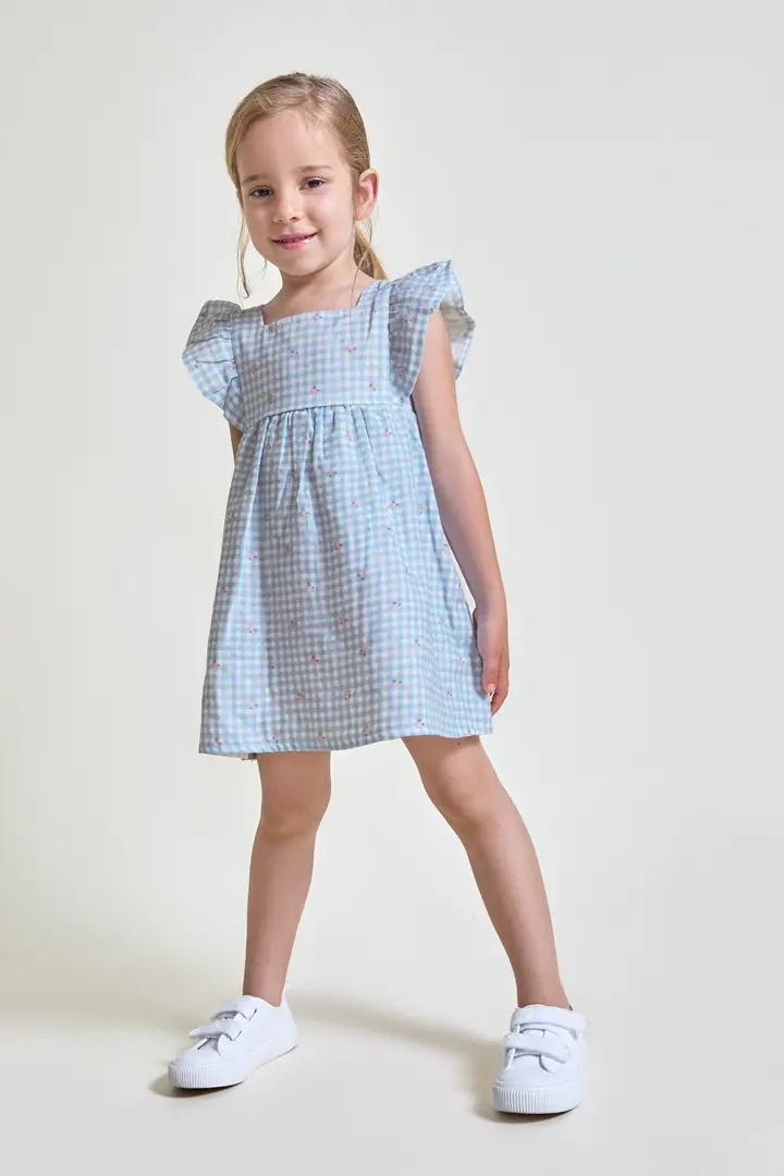 Vestido de menina em xadrez vichy azul claro, com pequenos detalhes delicados e corte leve. Tem decote quadrado, mangas com folhos e saia soltinha — perfeito para dias quentes, passeios e ocasiões especiais. Um clássico fresco e intemporal.