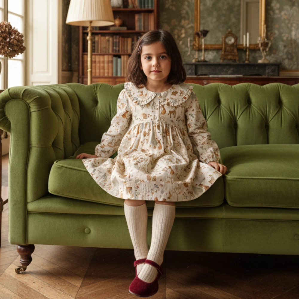 Em tom creme, com gola redonda com folho, manga comprida com punho elástico e abertura nas costas por fecho e botõezinhos decorativos. A saia franzida dá uma ligeira roda e movimento — perfeito para fotos e festas de Natal. Tecido suave e confortável, ideal para o dia inteiro.