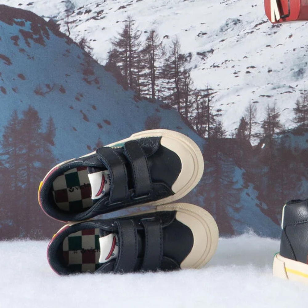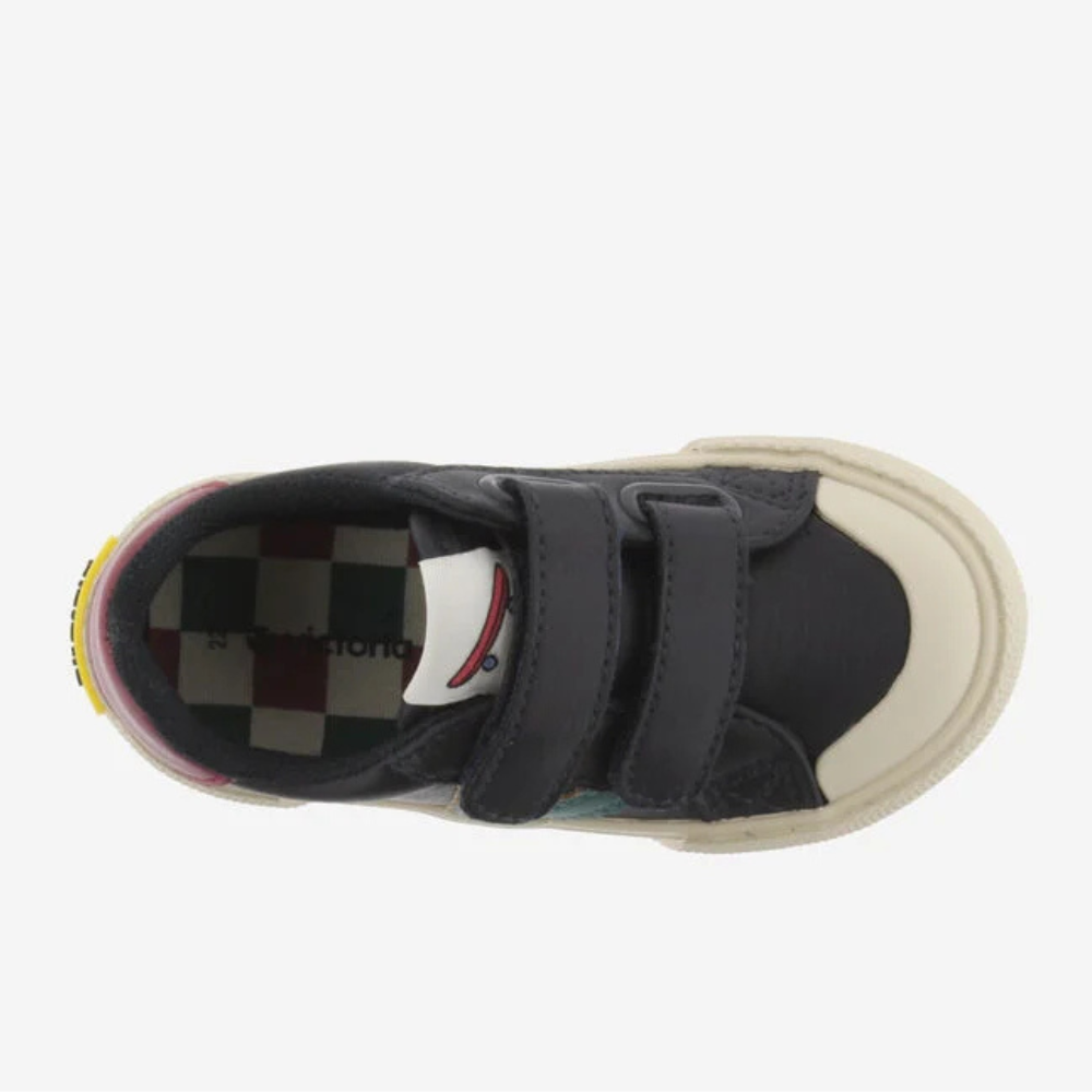 Sapatilhas de corte baixo para meninos em material com efeito pele. Fecho com duas tiras aderentes que facilitam o calce e promovem a autonomia. Sola em borracha dentada com reforço na biqueira para maior resistência e durabilidade.